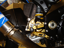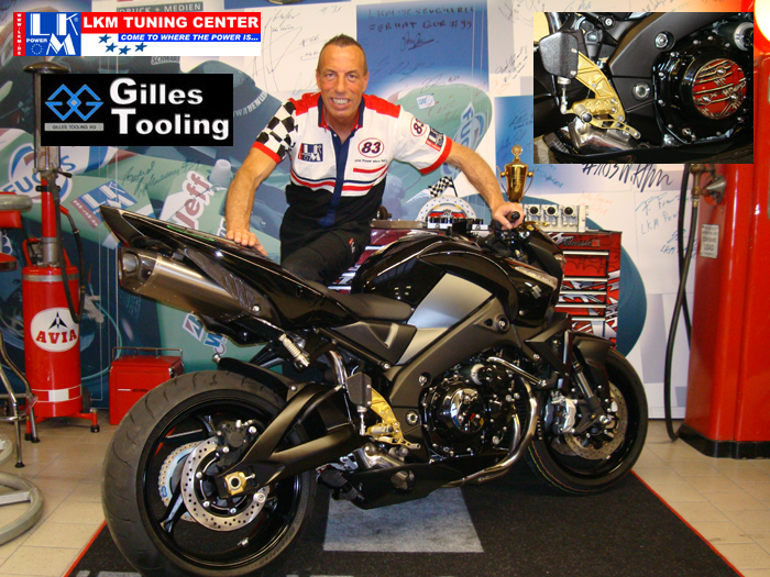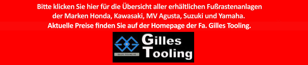 Gerhard Gilles (Gilles Tooling), ein ehemaliger erfolgreicher Rennfahrer mit LKM Power, stellte das erste Paar Fußrasten für seinen eigenen Rennsport selbst her. Nachdem er feststellte, wie groß die Nachfrage bei seinen Rennkollegen ist, kam ihm die Idee eine eigene Firma zu gründen. Mittlerweile werden seine Produkte auf der ganzen Welt vertrieben und von den besten Rennteams verwendet. Davon profitieren sowohl Streetfahrer als auch Racefahrer. Alle Gilles Tooling Parts werden selbstverständlich mit einem TÜV-Gutachten oder mit ABE ausgeliefert. Alle Teile sind aus hochfestem Aluminium 7075, welches für den Flugzeugbau entwickelt wurde. Der Vorteil des Materials liegt neben der ergonomischen Formung am niedrigen Gewicht. Die Schalt- und Bremshebel sind absolut spielfrei gelagert. Drei verschiedene Hebelübersetzungen und ein Carbonfersenschutz links zeichnen diese Teile in besonderem Maße aus. Die Fußrasten selbst sind hardcoated. Alle Anlagen sind erhältlich in Gold-, Titan-, und Schwarzeloxal oder teils kombiniert. |